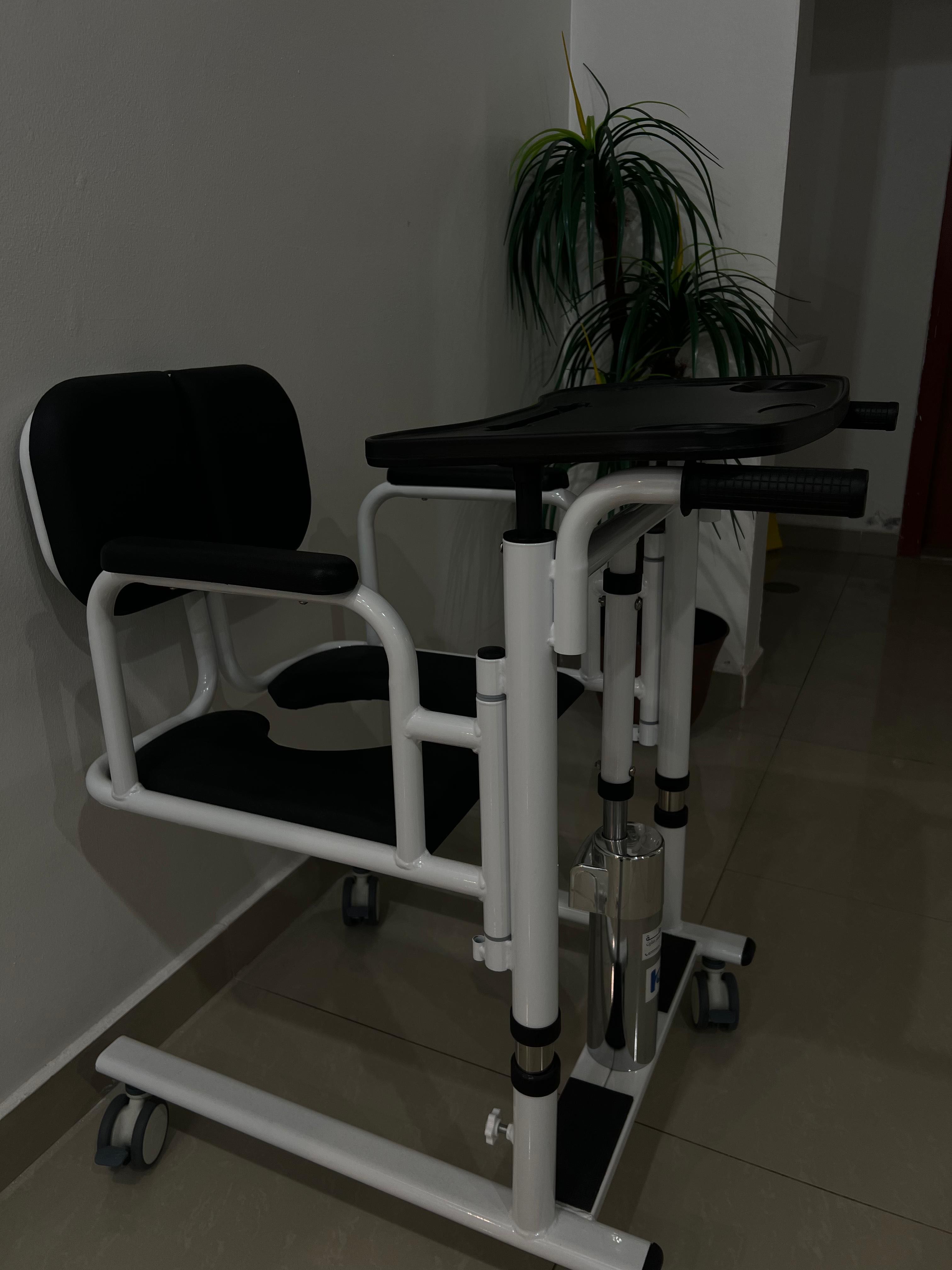 رافعة تشحن بالكهرباء وتعمل بالريموت كنترول لرفع شخص او معاق من الأرض او من مكان لآخر مع قابلية ضم العجلات او انفراجها للدخول بالابواب الصغيرة والكبيرة واسفل قطع الأثاث