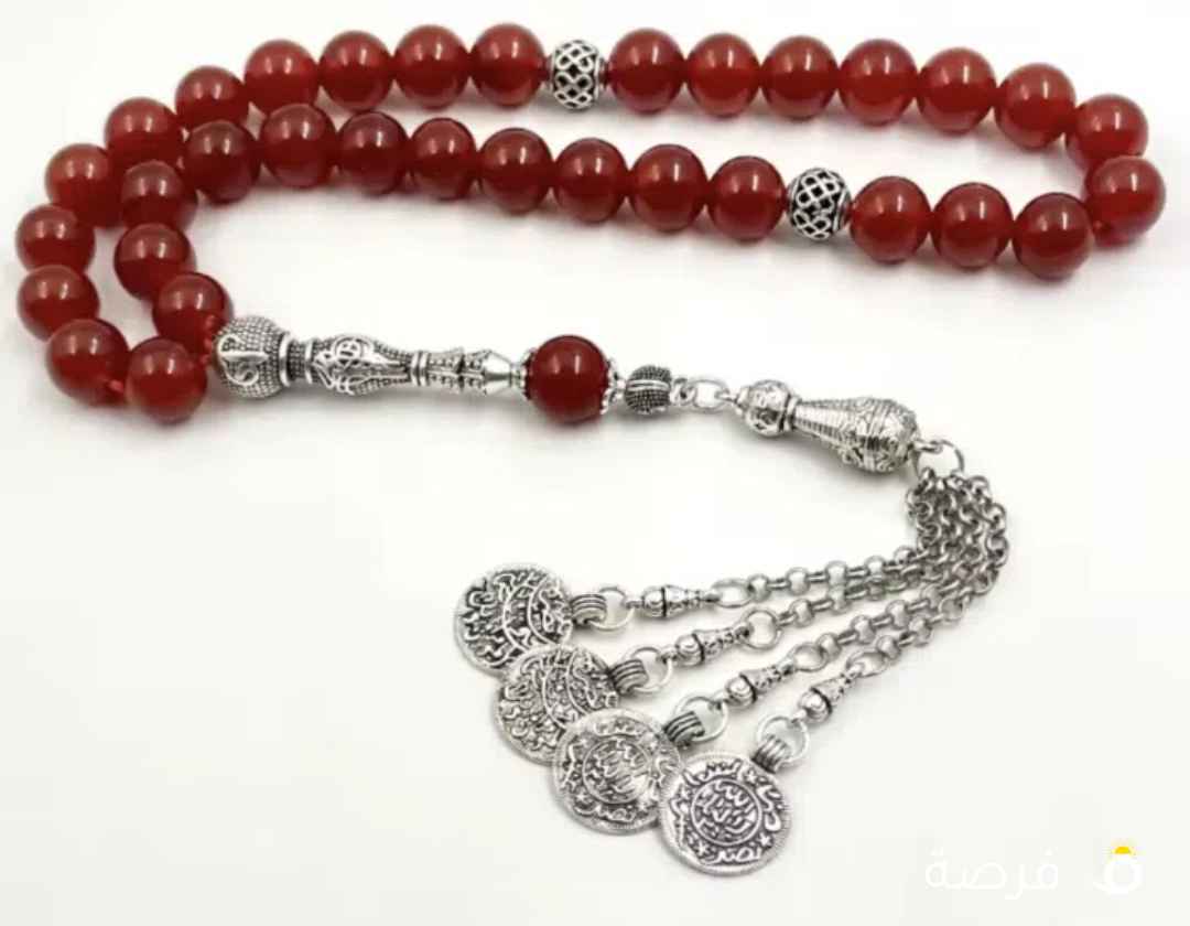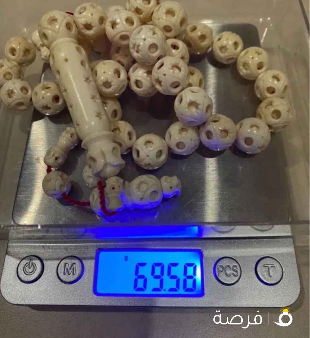 مسباح (سبحة) مصنوع من مزيج من خامات طبيعية، تظهر فيه حبات باللون البني (خشب الكوك) وحبات باللون الأبيض العاجي (عظم