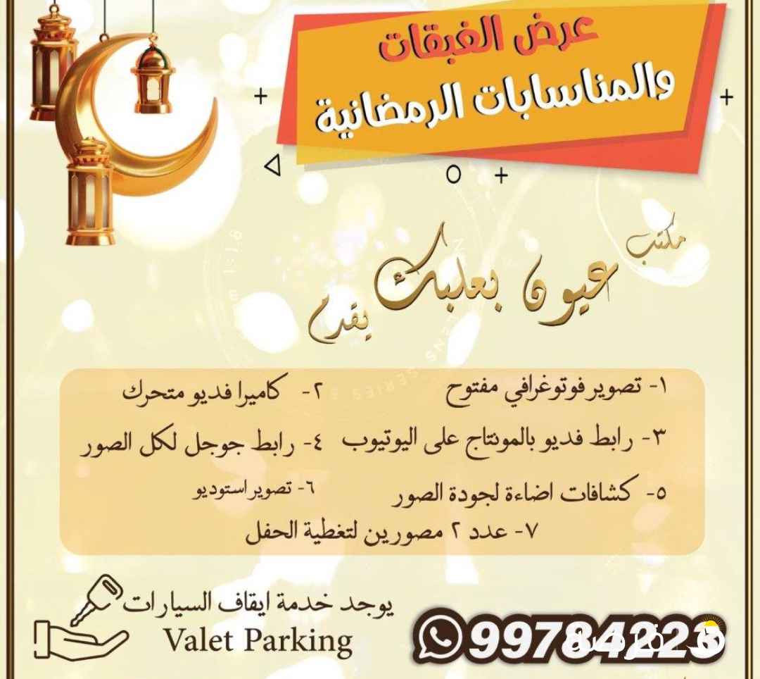 تبي تصور صور و فيديو يبرز شغلك بأحلى شكل؟ أنا مصوّر محترف بالكويت أقدّم: • تصوير منتجات ومطاعم بجودة عالية • جلسات تصوير شخصية وعائلية • تصوير مناسبات وحفلات • مونتاج وإخراج فيديو إعلاني أسعار مناسبة – جودة عالية و مضمونة – تسليم سريع - يوجد لدينا أيضا إدارة حسابات السوشيال ميدي